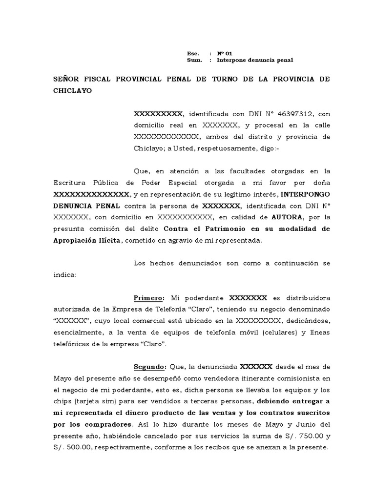 Modelo Denuncia Apropiacion Ilicita Vendedor Comisionista Telefonia Movil Pagos