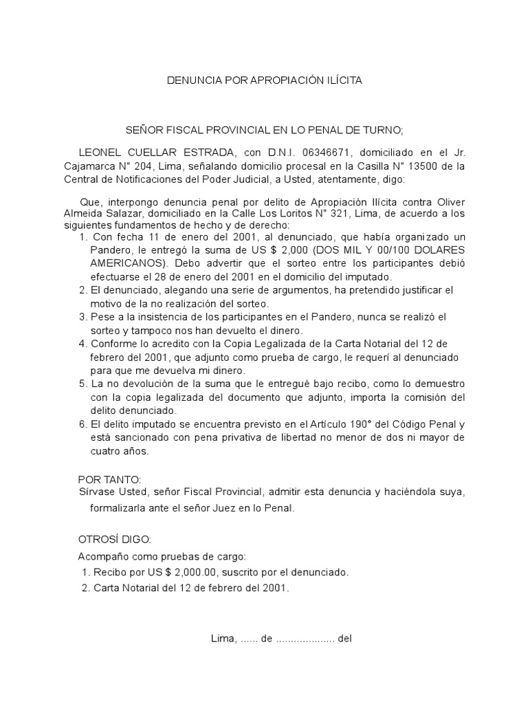Denuncia por Apropiacin Ilcita SEOR FISCAL ESPECIALIZADO EN LO PENAL DE LIMA- CONSTRUCTORA ASOCIADOS CC SAC identificado con RUC. Modelo de Denuncia Por Apropiacin Ilcita by ronaldo1gabriel1gome. Las penas del art.