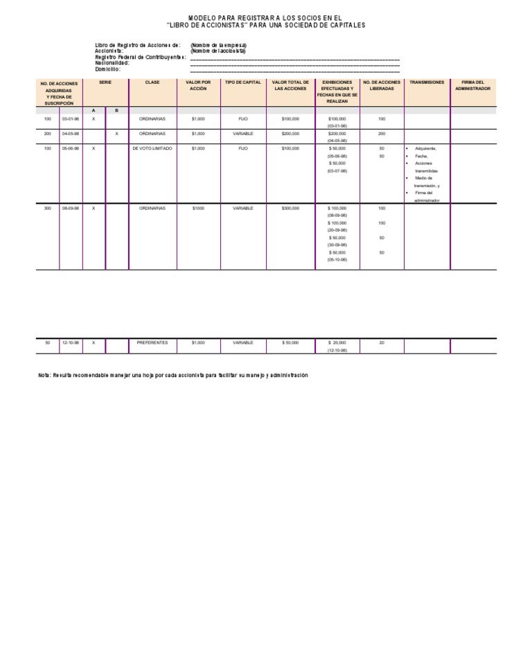 De la ley. Modelo para registrar a los socios en el libro de accionistas para una sociedad de capitales serie clase valor por accin tipo de capital valor total de las acciones exhibiciones efectuadas y fechas en que. Comunicacin de apertura traslado o clausura de delegaciones o establecimientos de Asociaciones en la Comunitat Valenciana.