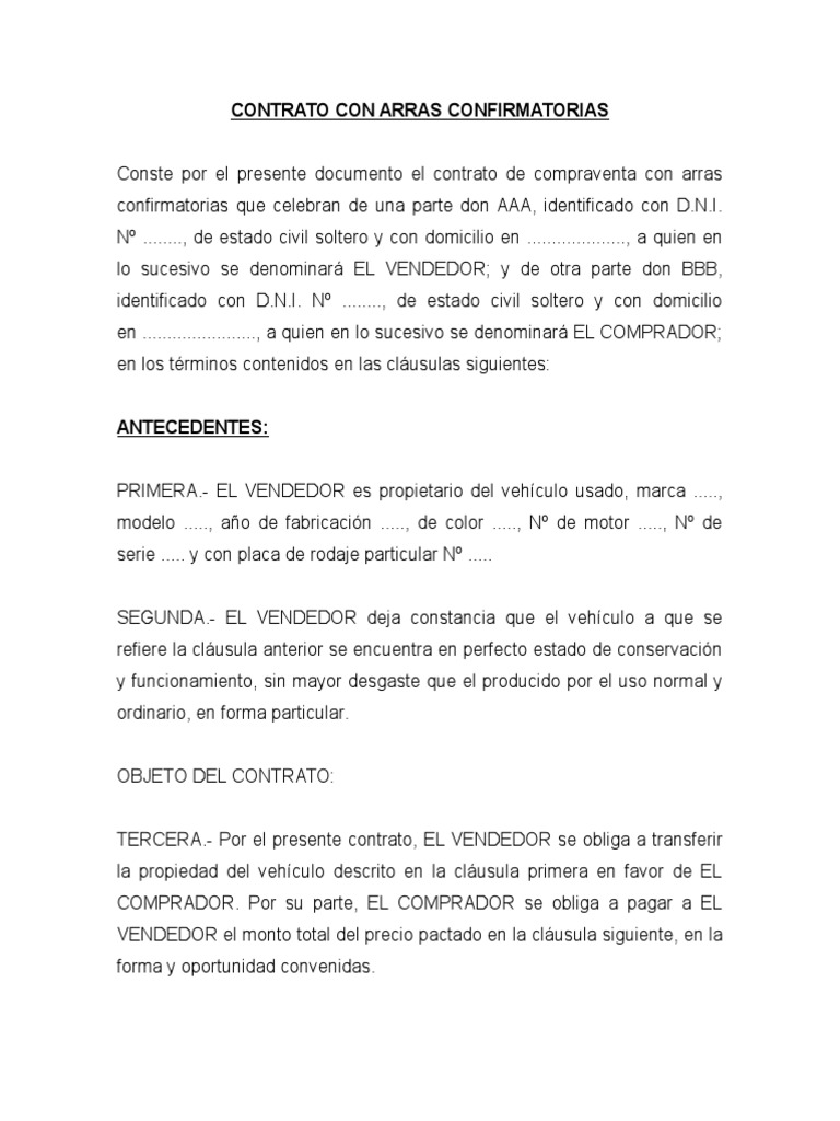 14 0 276KB Read more. Contrato de arras confirmatorias. Es la forma bsica de un contrato de arras en la cual el comprador entrega una parte del importe total del bien a comprar al vendedor.