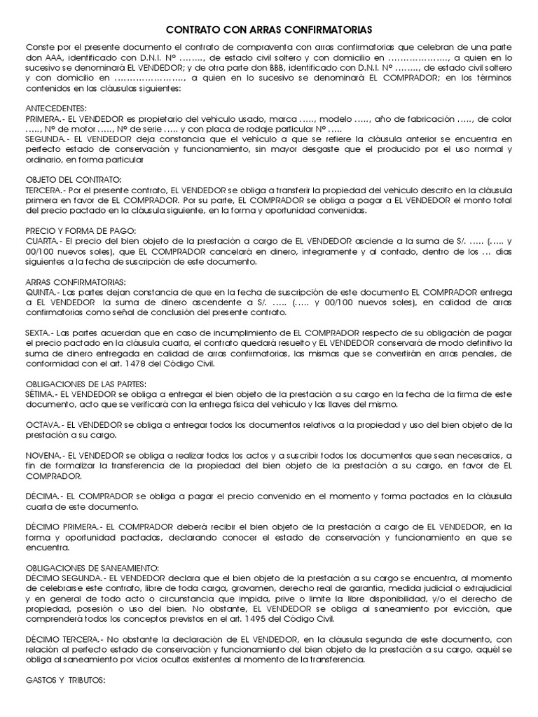As es posible hallar un modelo de contrato de arras confirmatorias arras penitenciales y arras penales. Las arras confirmatorias no estn reguladas expresamente en el Cdigo Civil. Contrato de Arras Confirmatorias.