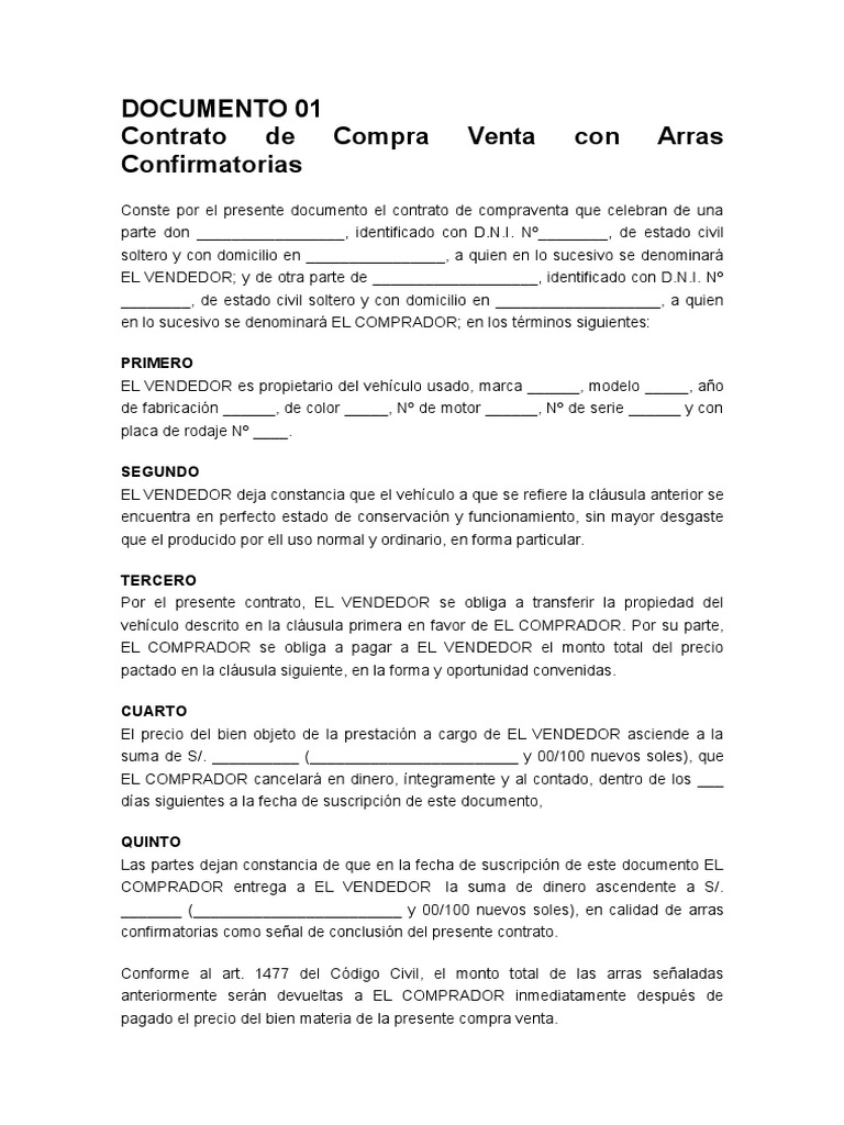 I- Que el Vendedor est interesado en la venta del vehculo de segunda mano de su propiedad que a continuacin se detalla En adelante El Vehculo por la cantidad de. El otorgamiento de la escritura pblica de compra-venta se producir simultneamente al pago del expresado resto del precio. Contrato de arras modelo De una parte DD.